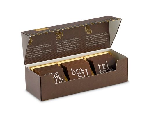 The Läderach Grand Cru Carrés are wafer-thin and perfect for intense pure chocolate enjoyment. Indulge yourself with these single-origin chocolate carrés and discover the variety of flavors of three provenances: Trinidad 80%, Brazil 70% and Madagascar 64%. (100g)